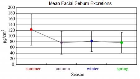 • Sebum excretion higher in the summer, but acne symptoms are toned down – higher summer sebum levels may be due to the increased fluidity of sebum in warmer conditions. Acne sufferers tend to observe an improvement in their acne symptoms during the summer, although this may be more directly related to factors such as UV light or stress levels than to sebum production.