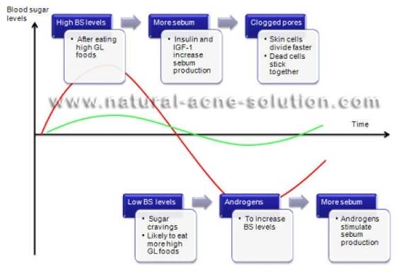 Acne joins the blood sugar roller coaster ride when you eat starch and sugar.  insulin and Insulin-like Growth Factor (IGF-1) hormone levels are increased.  Which can lead to: