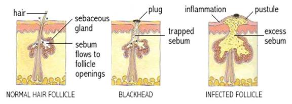• Secretion of sebum (a greasy substance that attracts acne-promoting bacteria) from pores.