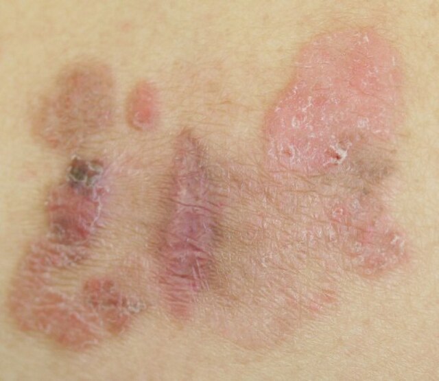 - Slow-growing, reddish-brown, flat or slightly raised patch of dry, scaly skin. Size ranges from a few millimeters to a few centimeters.