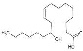 RA (C18H34O3) is a monounsaturated fatty acid produced in CO by hydroxylation of oleic acid. It is an omega-9 (C=C double bond in w9 position), 18-carbon fatty acid having a hydroxyl functional group at the 12th carbon, a very uncommon property for a biological fatty acid. This functional group causes RA (and therefore castor oil) to be unusually polar, and also allows chemical derivatives not practical with other biological oils.