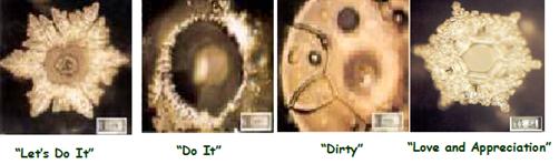 Experiments by Dr. Emoto. Samples of water were collected from different areas of the world. Water from each location was divided and placed into petri dishes. Various words were written and taped to the samples. The samples were then frozen, and viewed through a microscope at magnifications of 200-500X. Results were fully repeatable.