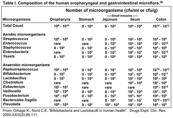 • For optimum intestinal flora balance, the beneficial, gram-postive Lactic Acid Bacteria (LAB), such as  Lactobacilli , LIGALACTObacilli  and Bifidobacteria, should predominate (Bifidobacteria account for ~ 90% of the total colonic beneficial microflora).    Presenting a barrier to invading organisms, they break down food carbohydrates to produce acids, such as lactic acid (break-down product of lactose). The most common of these lactic acid bacteria are: