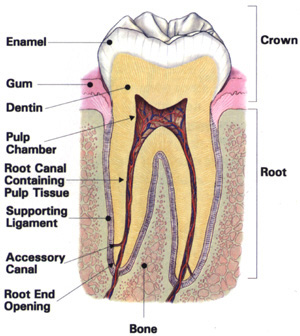 Cross section of a tooth illustrating the various structural regions susceptible to colonization or attack by microbes