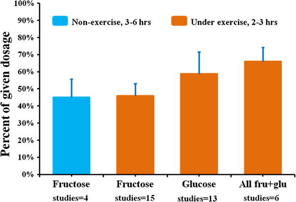 • With exercise:  The mean average oxidation rate of fructose was about 45.8% within 2-3 hours. Ingesting fructose with glucose, the oxidation rate increased to ~66%