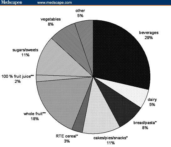 • Sugar-sweetened beverages (SSBs) were the source of 30% of fructose for all age groups and almost 50% of fructose for adolescents. Grains (including breads, cereal, cakes, pies, and snacks) were the second-largest source (11-12%).