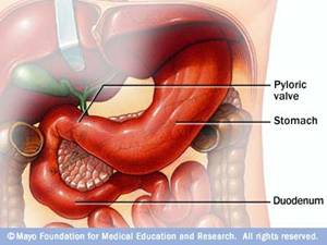 - Non-opening of pyloric sphincter (valve at bottom of stomach)-its contracting too strongly prevents release of food into small intestine.
