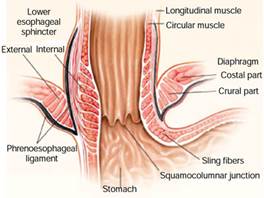 The LES is composed of a smooth muscle fibers in the lower 3-4 inches of the esophagus below the diaphragm in the esophagogastric Junction (EGJ, the junction of the lower end of the esophagus with the stomach). The LES muscle fibers are in the form of “C-shaped” fibers (not circular) that “clasp” each other. and are surrounded by sling fibers over the upper stomach (fundus). Modulated by neural / hormonal mechanisms, the clasp-like semi-circular LES muscle fibers have significant myogenic tone, having the main control over basal (resting) LES tone. LES contraction is somewhat controlled by the excitatory motor neurons and LES relaxation is innervated by the inhibitory motor neurons located either locally within the LES or in the esophagus Brookes SJH et al, 1996. However, the LES clasp-like muscles are not as responsive to cholinergic stimulation (i.e.stimulation by the neurotransmitter acetycholene, as the gastric oblique sling muscles located over the stomach. The excitatory (cause contraction) and inhibitory (inhibit contraction) motor neurons cause these gastric sling fibers to contract vigorously to cholinergic stimulation (i.e. acetylcholine), dopamine and other agents. Tian ZQ et al, 2004; Preiksaitis HG et al, 1997