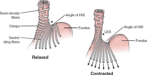 (1) The muscle cells themselves (myogenic). Gastric sling muscle fibers loop around the esophagogastric Junction (EGJ, the junction of the lower end of the esophagus with the stomach) and affect LES tone. Gastric sling fibers form the oblique muscle layer of the stomach and intermingle with the C-shaped fibers of the LES. Loss of gastric sling function is thought to be associated with severe reflux disease.