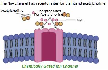 - Chemically gated (also called ligand-gated). Opened/closed by certain binding molecules (e.g. neurotransmitters, hormones).