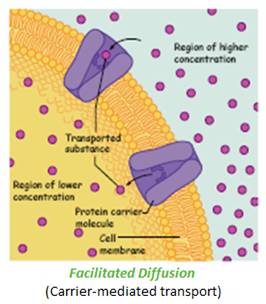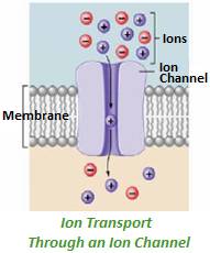 (b) Facilitated diffusion – carrier-protein or ion-channel mediated. Substances are transported down an electrical or chemical concentration gradient facilitated by a carrier-protein or ion-channel spanning the membrane. Solutes, such as charged ions in solution (E.g. Na+, K+ and Cl- as solutes)require a carrier or channel to cross the membrane to avoid coming into contact with the water-hating core of the membrane lipid-bilayer. (A carrier or channel is made of protein molecules with a water hating, lipid loving exterior which “happily” spans the membrane, and a water-loving center through which water and small water soluble molecules can pass). Some substances, such as glucose, are too large to pass directly through the membrane, but are able to cross when provided a carrier large enough to accommodate them. Some molecules, such as starch and proteins, are just simply too large to cross the cell membrane.