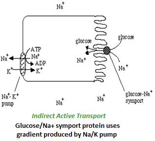 (b) Indirect active transport mechanism. E.g. Used to transport glucose. Involves using energy to establish a gradient across the cell membrane, and then utilizing that gradient to transport a molecule against its concentration gradient. The Na+/glucose indirect active transport mechanism, in particular, uses the Na / K pump as the first step, generating a strong Na+ gradient across the cell membrane. Then the glucose / Na+ symport protein uses that Na+ gradient to transport glucose into the cell. (Symport means binding two molecules at a time and using the gradient of one solute’s concentration to force the other molecule against its gradient).