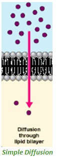 (a) Simple diffusion – through membrane lipid bi-layer. A substance moves freely across the membrane lipid bilayer down a concentration gradient (i.e. diffuses from an area of high concentration to an area of low concentration )