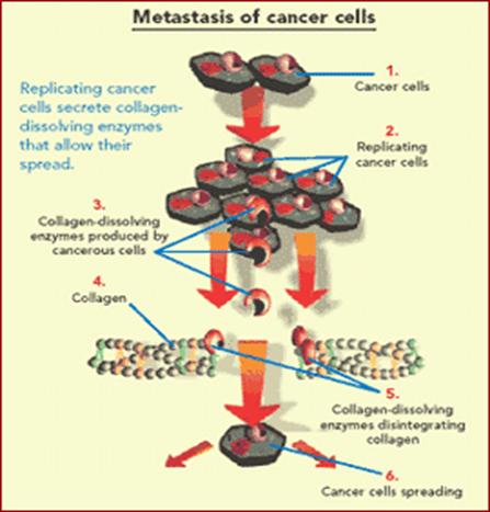 “Cancer cells produce and secrete millions of enzyme molecules, which, like scissors, cut collagen and tissue that surrounds cells. . . Cancer cells use these enzymes to cut little holes in the blood vessel wall and get into the blood stream where they can travel to other organs, such as the lungs. Using the same mechanism, cancer cells can settle there and start new tumor growth.”