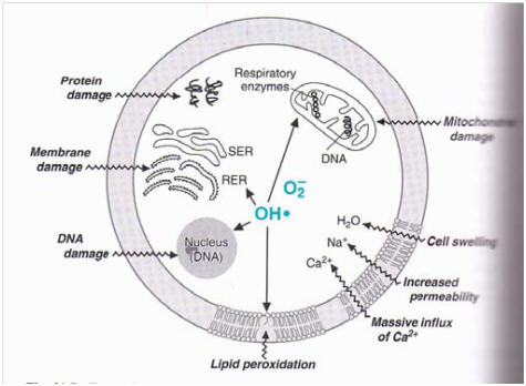 ROS mediate cellular injury. Superoxide O2• –and hydroxyl OH• radicals initiate peroxidation in the cellular, mitochondrial, nuclear, and endoplasmic reticulum membranes. E.g. This increases the cellular permeability for Ca2+ ions whose increased cellular concentrations damage the mitochondria.