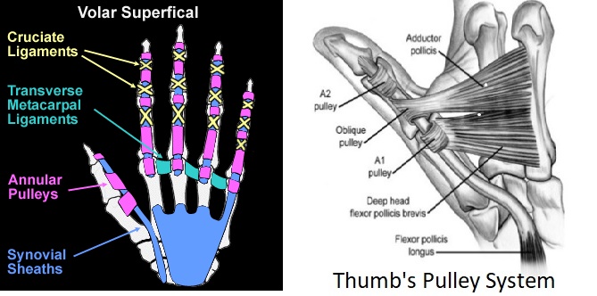 - Fingers have 4 or 5 Annular (A) pulleys and 3 cruciate ligaments. The thumb has 3 A pulleys and one oblique pulley. The first annular pulley (A1 pulley) lies near the head of the metacarpal bone (in line with the knuckles).